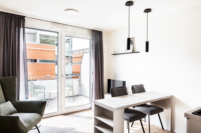 Die Apartments vereinen durchdachte Funktionalität mit einem Hauch von Luxus. Bodentiefe Fenster, eine praktische Küchenzeile, ein stilvoller Wohn- und Essbereich sowie ein erstklassiges Badezimmer lassen keine Wünsche offen. Für deine persönlichen Rückzugsmomente steht dir ein eigener Balkon oder eine Terrasse zur Verfügung.